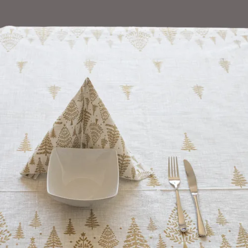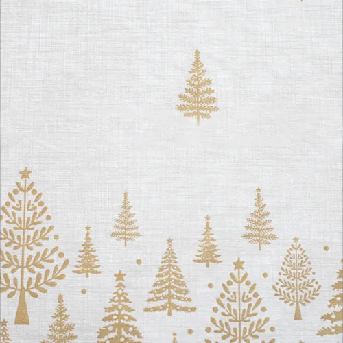 La delicata fantasia presenta abeti stilizzati color oro che risaltano su un elegante fondo chiaro, arricchito da una texture che ricorda la trama del lino. Questo contrasto tra l’opacità del fondo e la luce calda dell’oro conferisce alla mise en place un immediato tocco di luce e un design di grande tendenza.