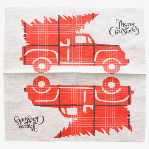 La fantasia con il classico camioncino rosso in trama tartan (o kilt) e l’augurio “Merry Christmas”, su un raffinato sfondo effetto lino, valorizza la mise en place con un tocco rustico e di tendenza.